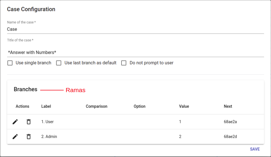 Ramificación: Aquí es donde podremos dar al cliente varias opciones para elegir.