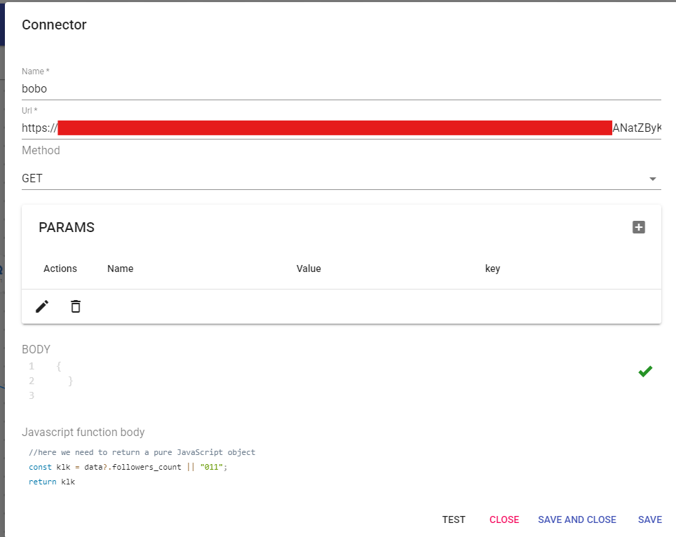- TEST: Permite probar el conector para verificar si la solicitud y el procesamiento de datos funcionan correctamente.