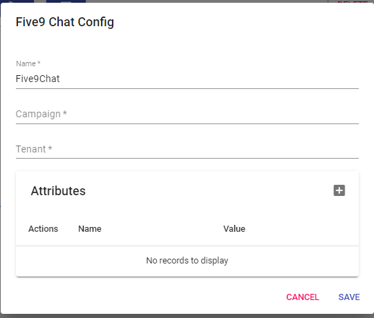En esta parte es donde haremos una conexión con Five9. Como podemos ver, nos pide agregar nuestra campaña y nuestro tenant. La parte de atributos es donde enviaremos parámetros a Five9 que veremos más adelante en la explicación de cada campo.