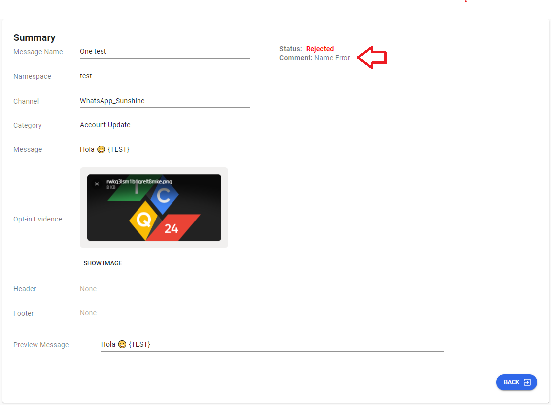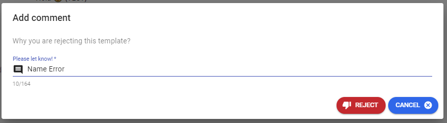 Luego, al hacer click en el botón de "REJECT", se abrirá una pantalla requiriendo que se informe sobre porque se está rechazando la plantilla.