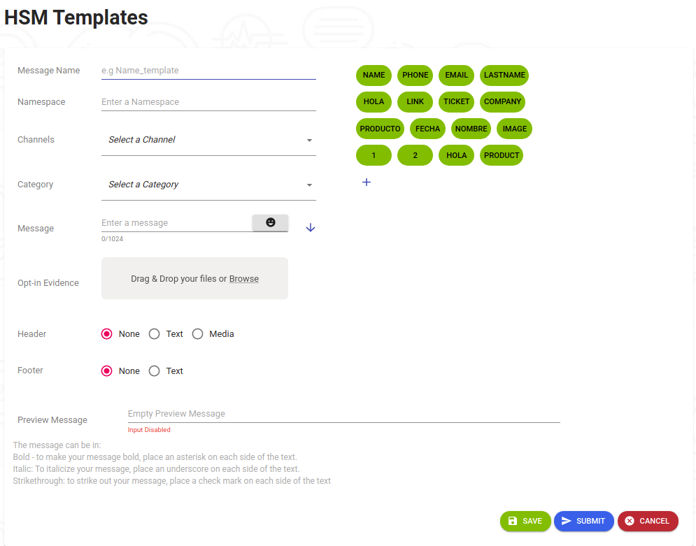 Luego de llenar la información necesaria de la plantillas, se tiene la opción de cancelar la plantilla mediante el botón "CANCEL", guardar la plantilla para futura modificación mediante el botón "SAVE", o enviar la plantilla para aprobación mediante el botón "SUBMIT".