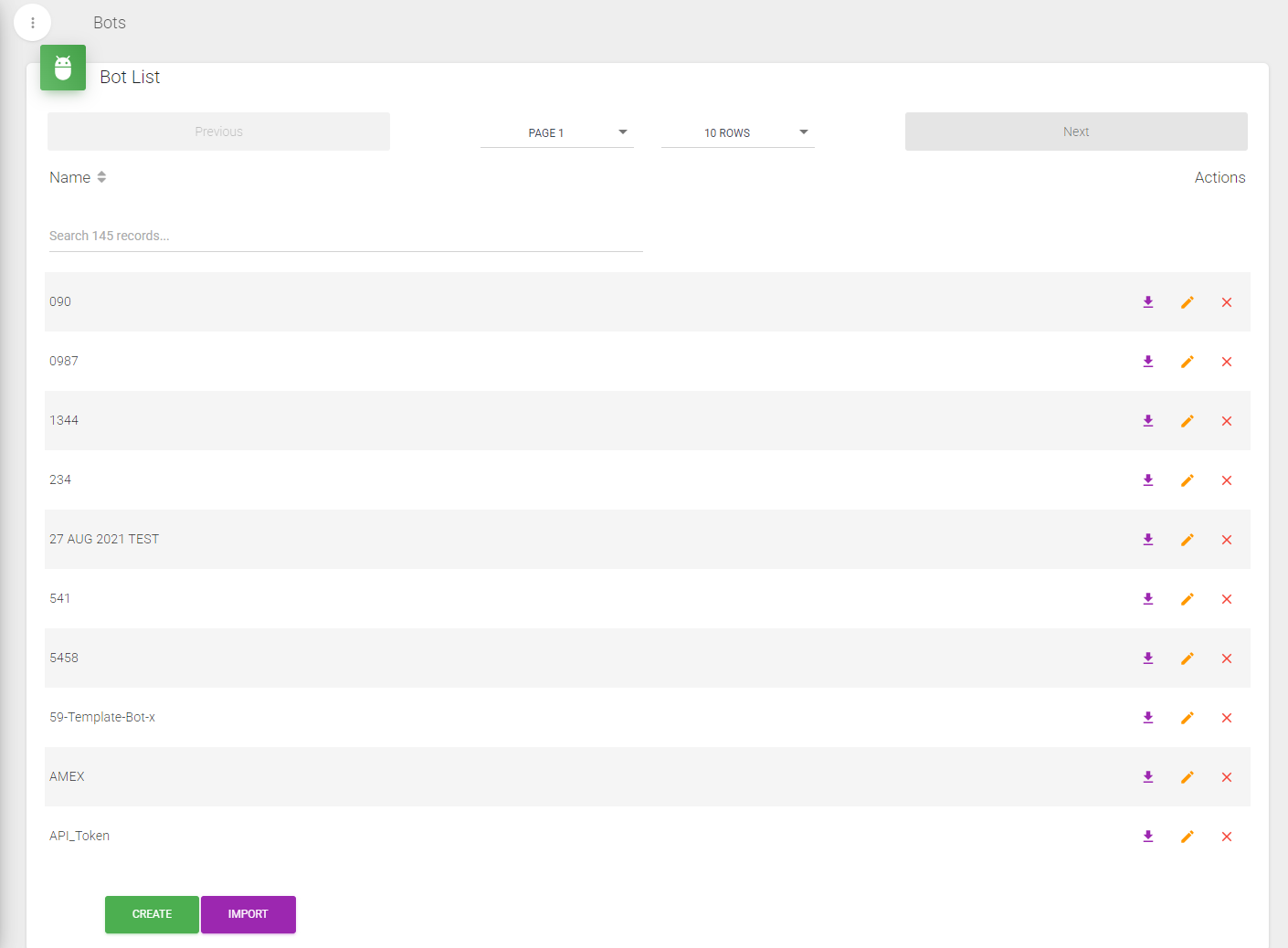 Upon entering this page, you will see a list of all programmed bots with options to create, edit, or delete bots according to your needs.