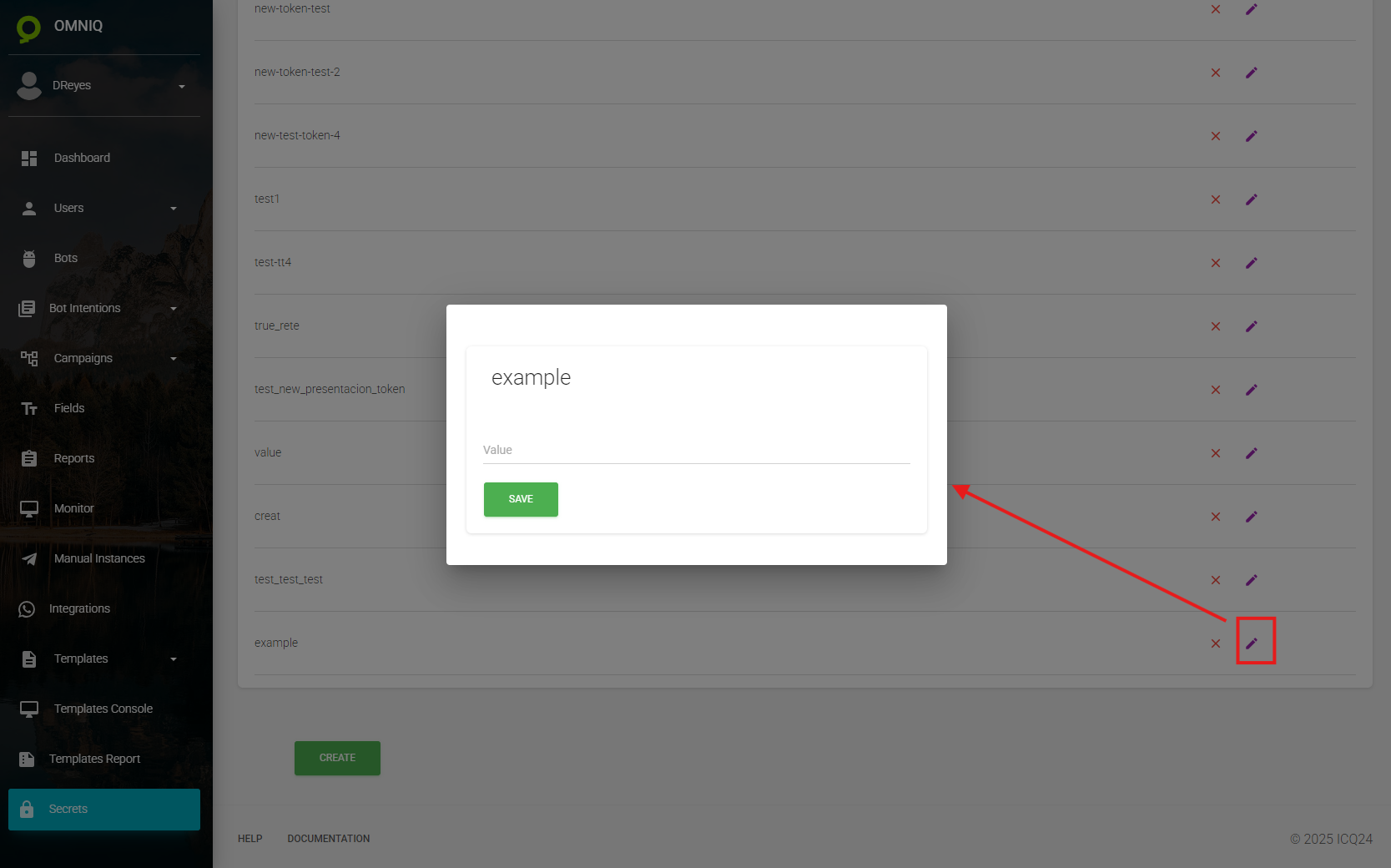 Hello! Welcome to the updating or editing secrets section in OmniQ. This allows you to change the value of an existing secret, such as updating a key or password. It's like correcting or improving important data that your bot uses. You don't need to program to do it!